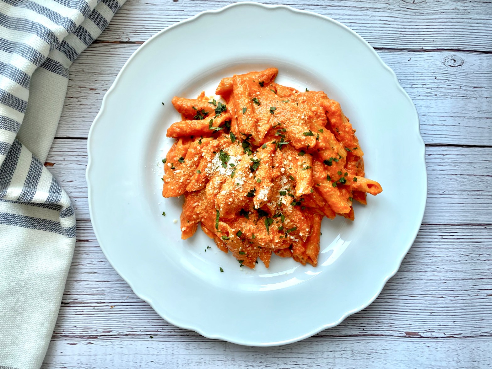 Recepta italo-americana clàssica. Podreu imaginar maneres mes simplificades de fer-la i que segur que queden molt be. Bàsicament salsa de tomàquet, nata i un rajolí de Vodka. Atenció nens molt petits, part del Vodka queda cru.